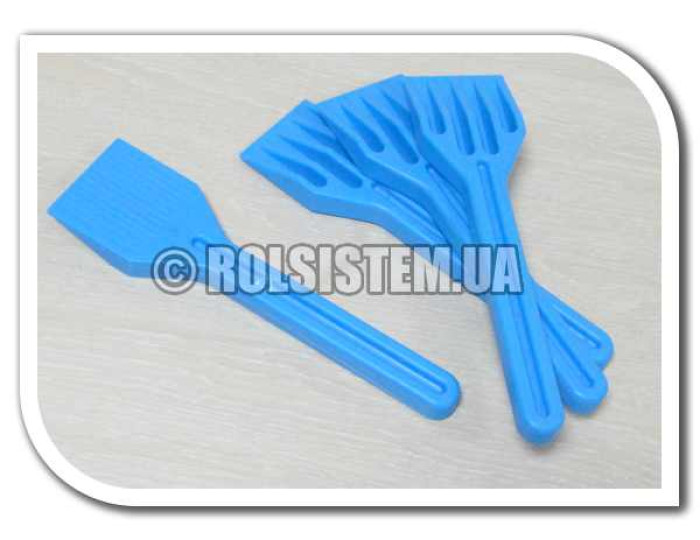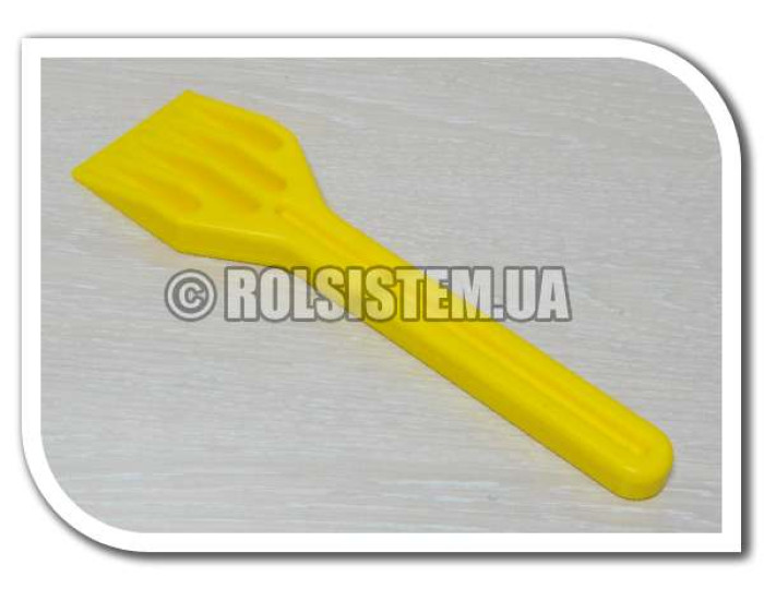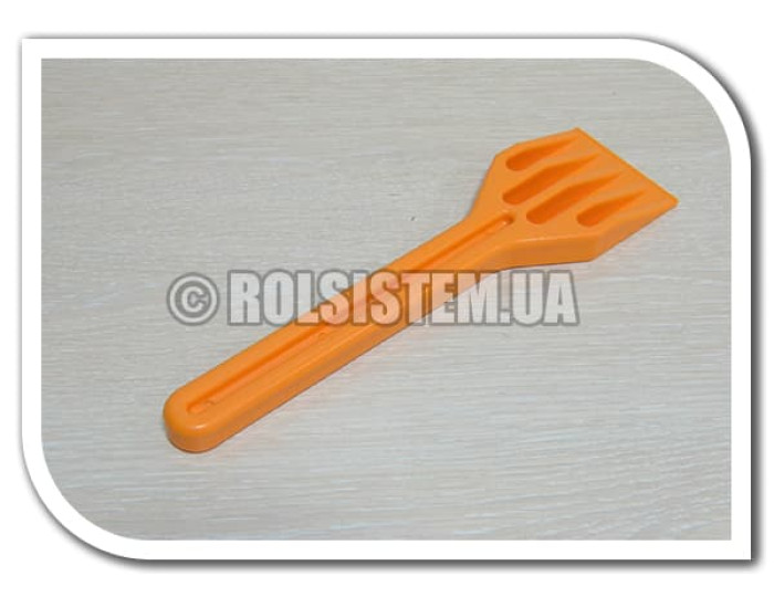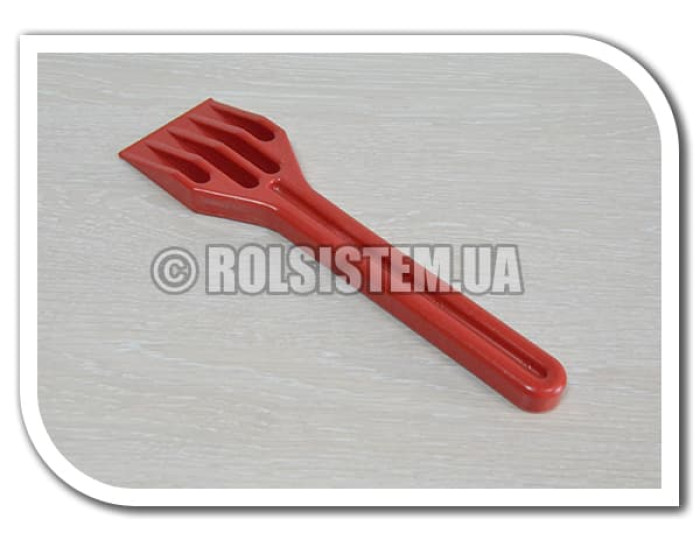 Лопатка предназначена для монтажа стеклопакетов и точного выравнивания их положения в оконной раме. При надавливании на ручку инструмент позволяет смещать стеклопакет от края профиля без риска образования сколов и трещин, обеспечивая безопасную установку.